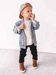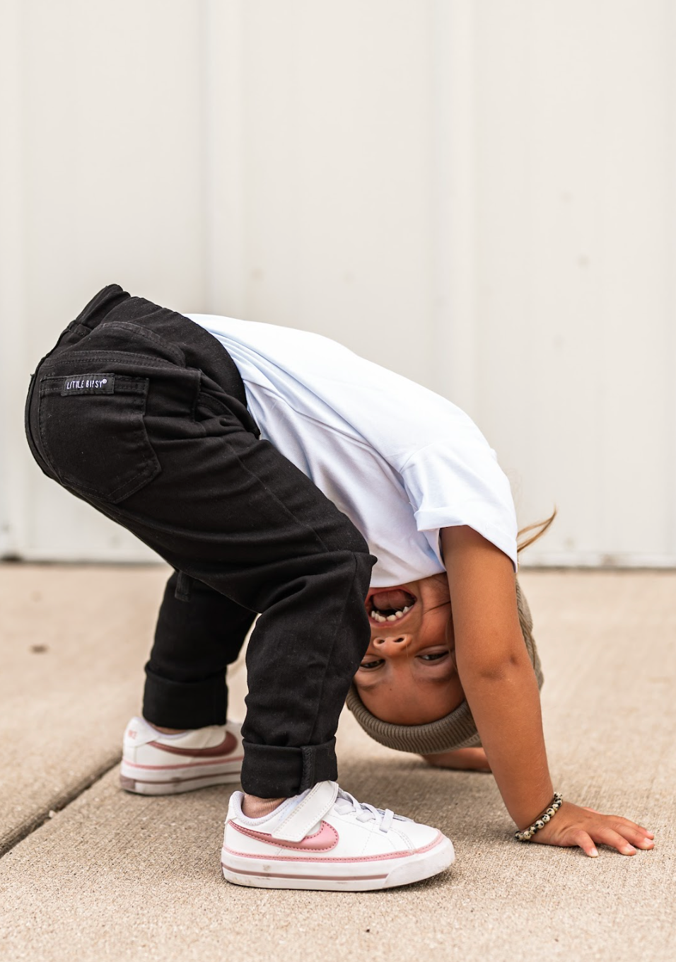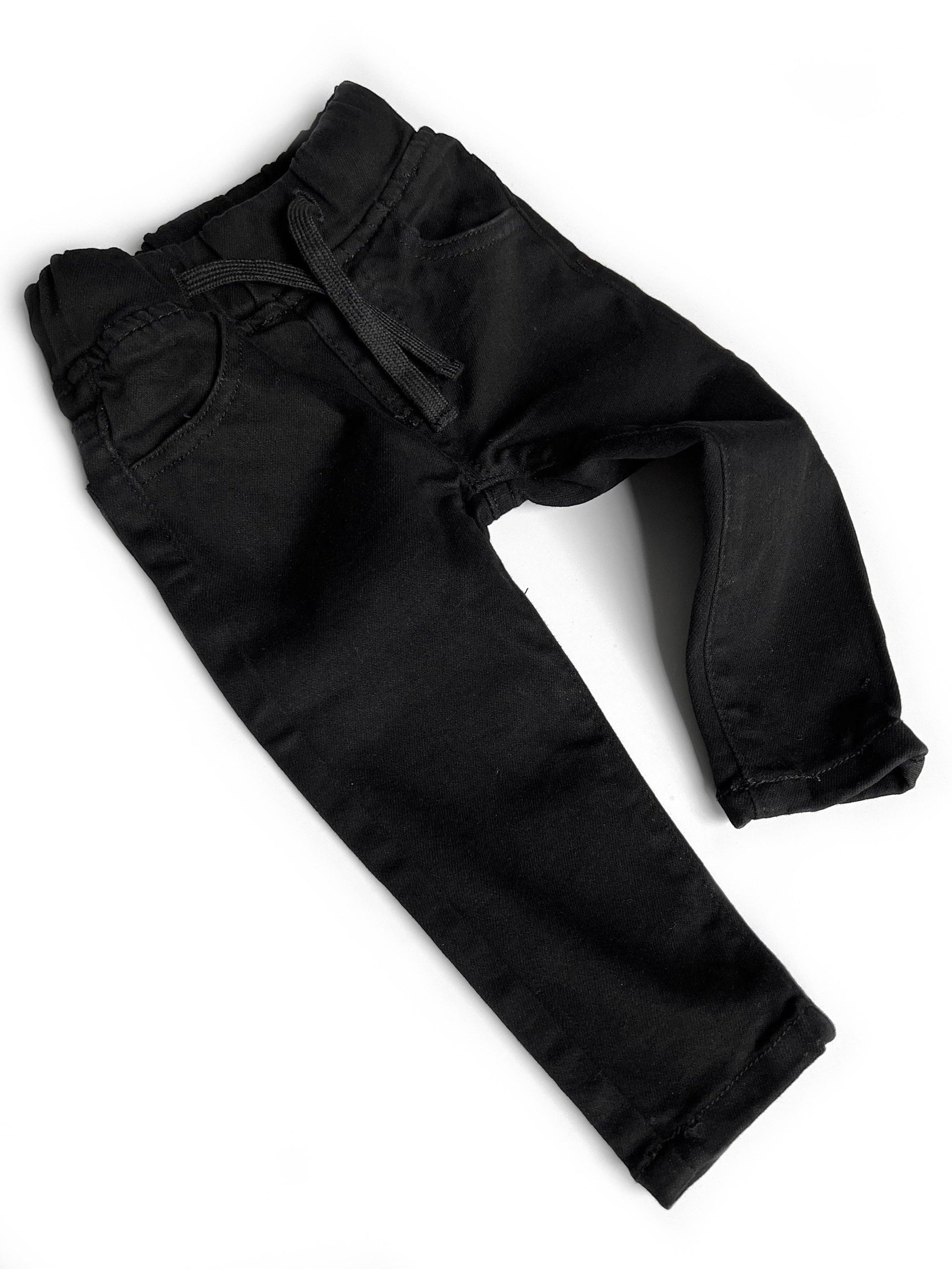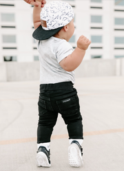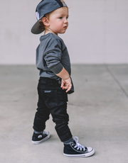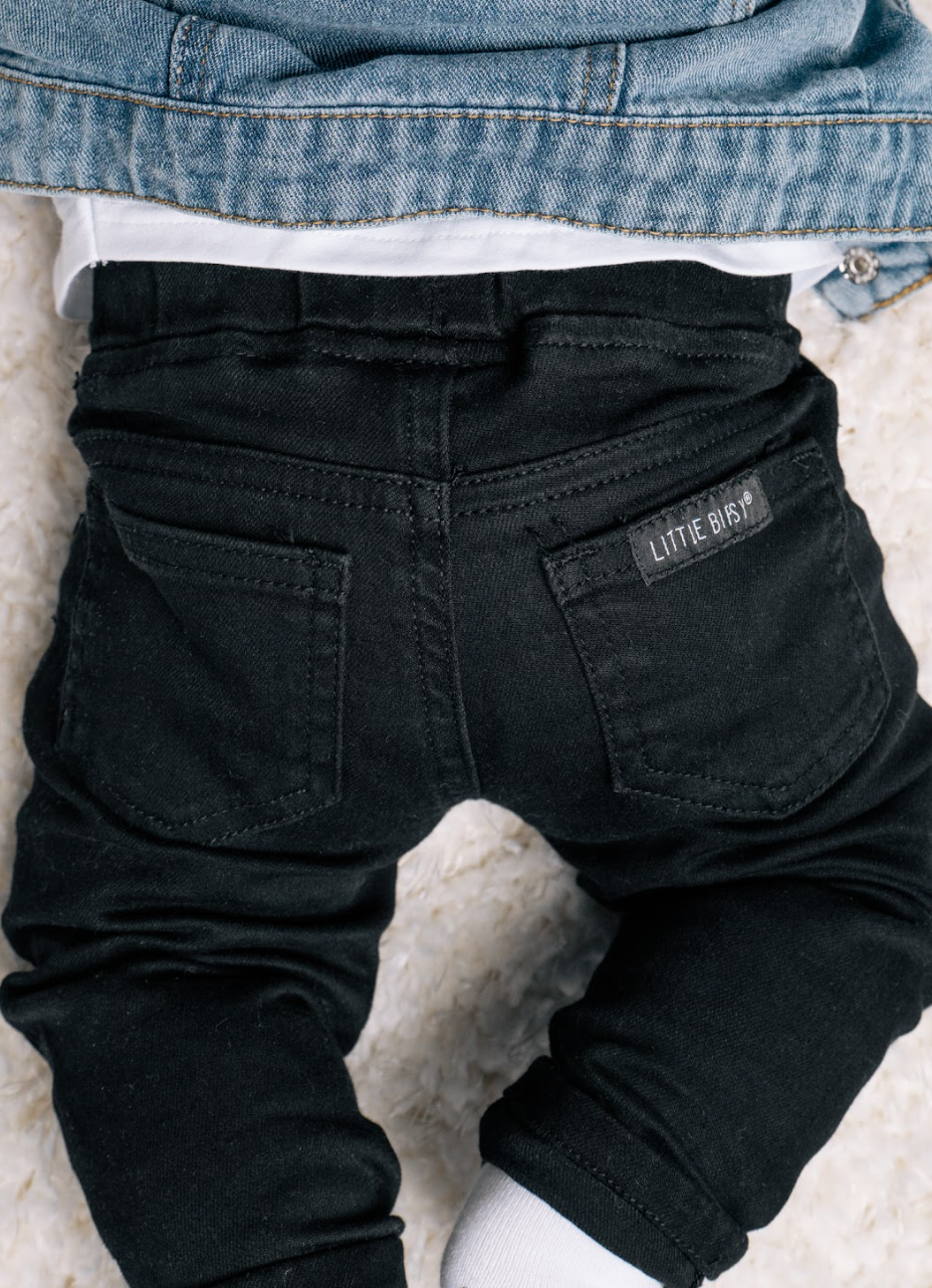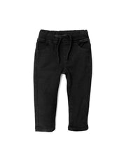 Meet your new favorite jeans. Our Black Denim makes any outfit look effortlessly cool. These jeans were designed with an elastic waistband + functioning drawstring for easy dressing, as well as a versatile black wash, 4-way stretch fabric, and a straight leg fit for all day comfort + non-restricting play.