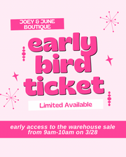 What is an Early Bird Ticket: This ticket gets you EARLY access to the Warehouse Sale at Joey and June Boutique! You get to access the sale from 9am-10am!