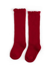 Cherry Lace Top Knee Highs for babies, toddlers and girls! The truest red - perfect for the holiday season! These vintage inspired knee high socks are perfect for all of her holiday adventures.