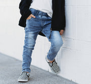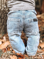 Meet your new favorite jeans. Our Light Wash Denim makes any outfit look effortlessly cool. These jeans were designed with an elastic waistband for easy dressing, as well as a custom light wash, 4-way stretch fabric, and a straight leg fit for all day comfort + non-restricting play.