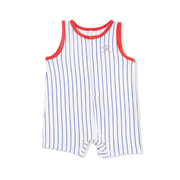 Your little one will be the cutest player on the field in this baby sleeveless shortie romper! Dressed in timeless baseball stripes, this adorable one-piece is made for tiny adventurers who love to move and play. The sleeveless design keeps babies cool and comfy during warm days, while the fun striped pattern adds that perfect touch of charm. Whether it's a day at the park, a family gathering, or just hanging out at home, this romper is the go-to outfit for parents who want their babies looking stylish and feeling free to explore. Simple, sweet, and oh-so-fun!