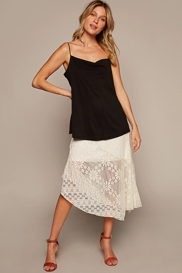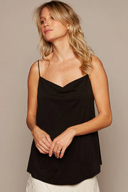 Elevate your style with our Women's Sleeveless Tank Top in Jet Black. Made from our luxurious ROSE PETAL fabric, this top boasts a softness that feels like a rose petal against your skin. The relaxed fit and draped cowl neckline add a touch of elegance. With a bust measurement of 18 1/2" and a length of 23 1/2", this top is perfect for any occasion.